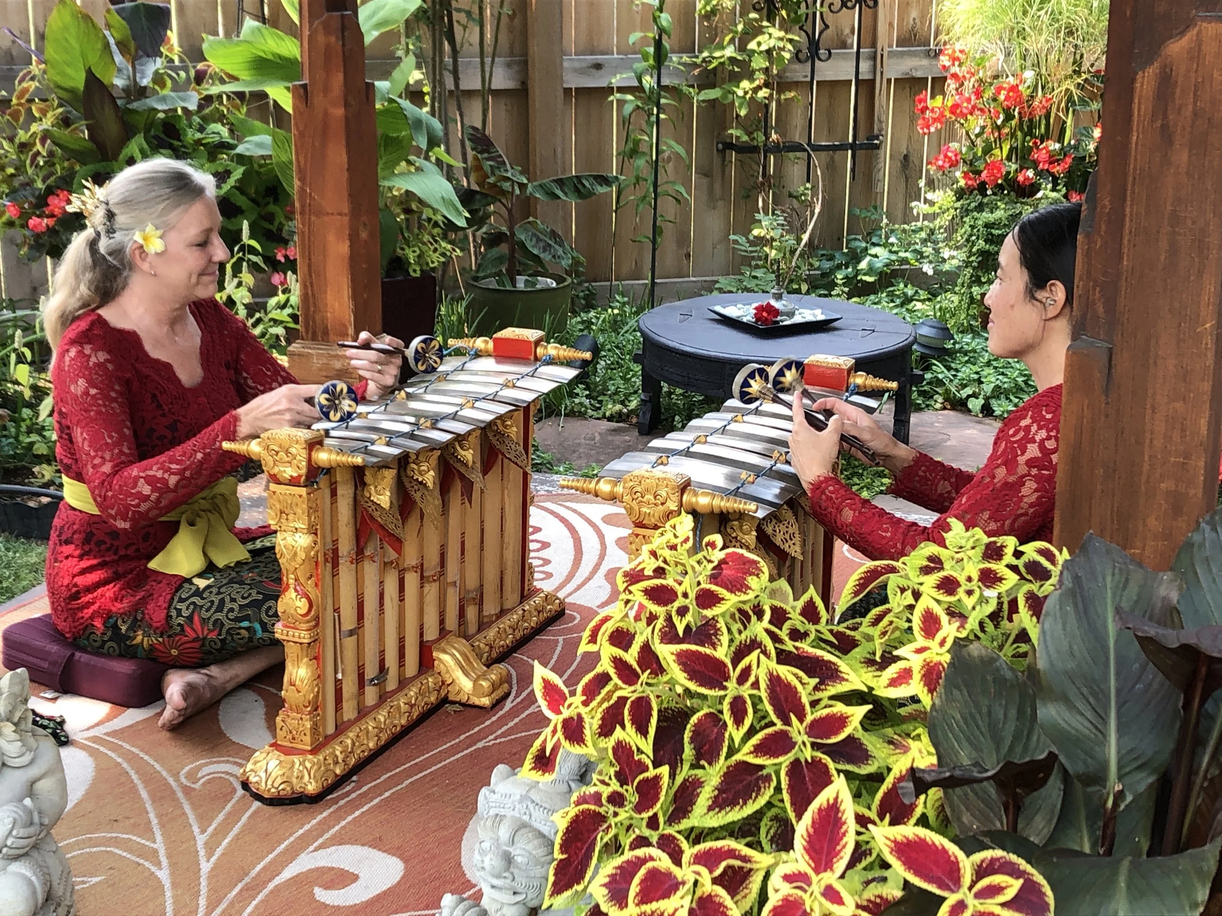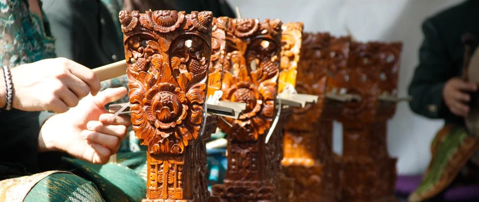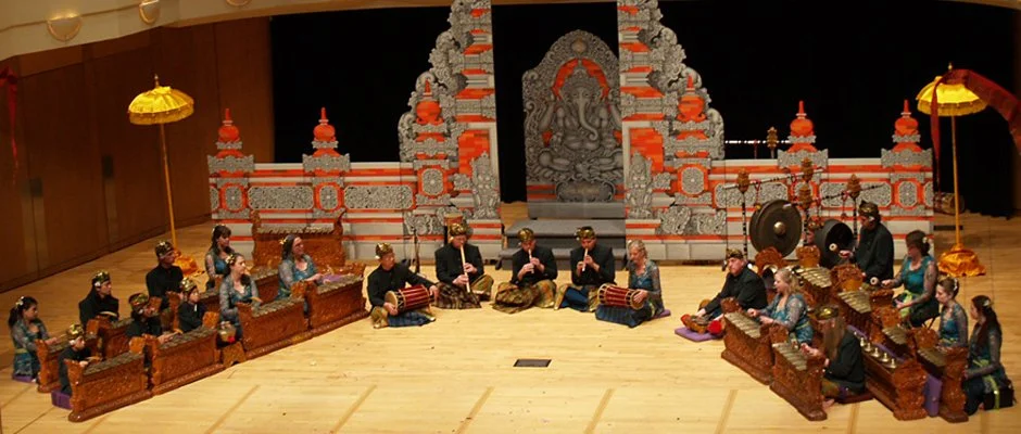 In the liner notes to Gamelan Tunas Mekar's first CD, released in the Spring of 1995, David Harnish says: "Gamelan angklung is a four-tone orchestra, one of more than twenty different types of indigenous gamelan in Bali consisting of gongs, metal xylophones, cymbals, flutes, and drums. The term "gamelan" (from the Javanese gamel, to strike) refers to a group of instruments meant to be played together (i.e. an ensemble), while the term "angklung" refers to tuned bamboo rattles which were long ago discarded from most ensembles of their namesake. Gamelan Tunas Mekar plays the vibrant music that accompanies temple festivals and traditional life-cycle rites, including tooth filings and cremations, as well as more recreational events. The traditional compositions are considered music for the deities while more modern pieces display the virtuoso technique of Balinese gamelan. For the Balinese, music and dance are an inseparable part of their uniquely Hindu faith within the largely Islamic nation of Indonesia."